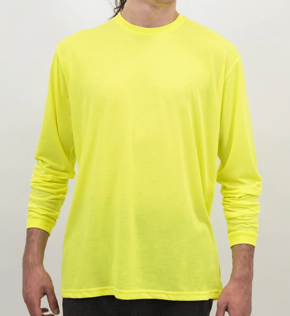 100% polyester (not Safety Colors) interlock with moister-wicking and UV protection performance.